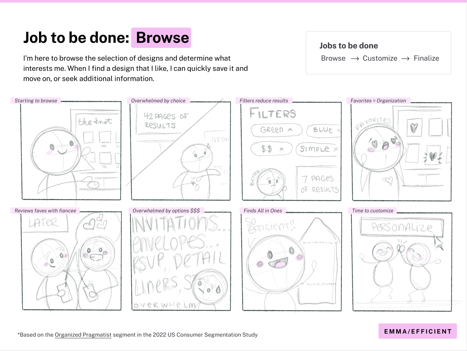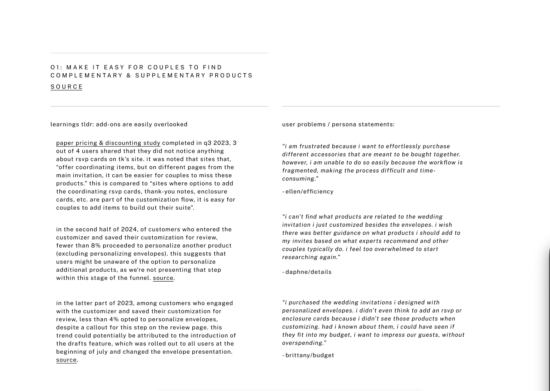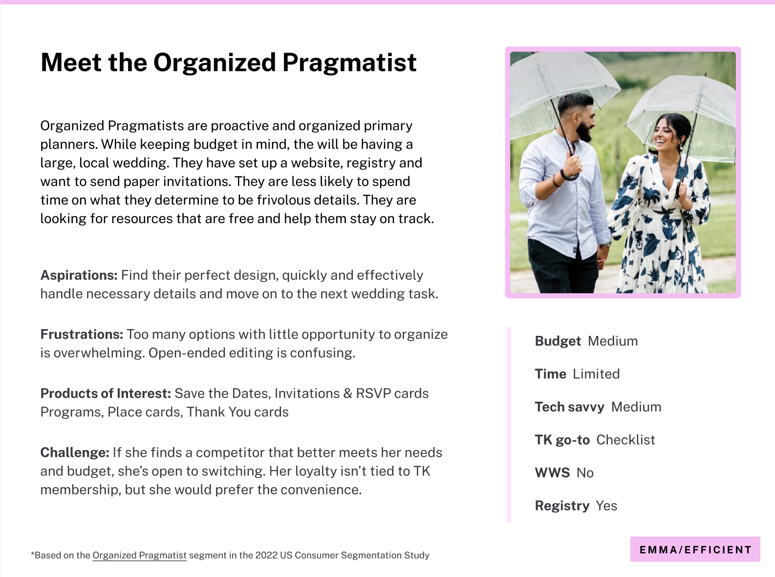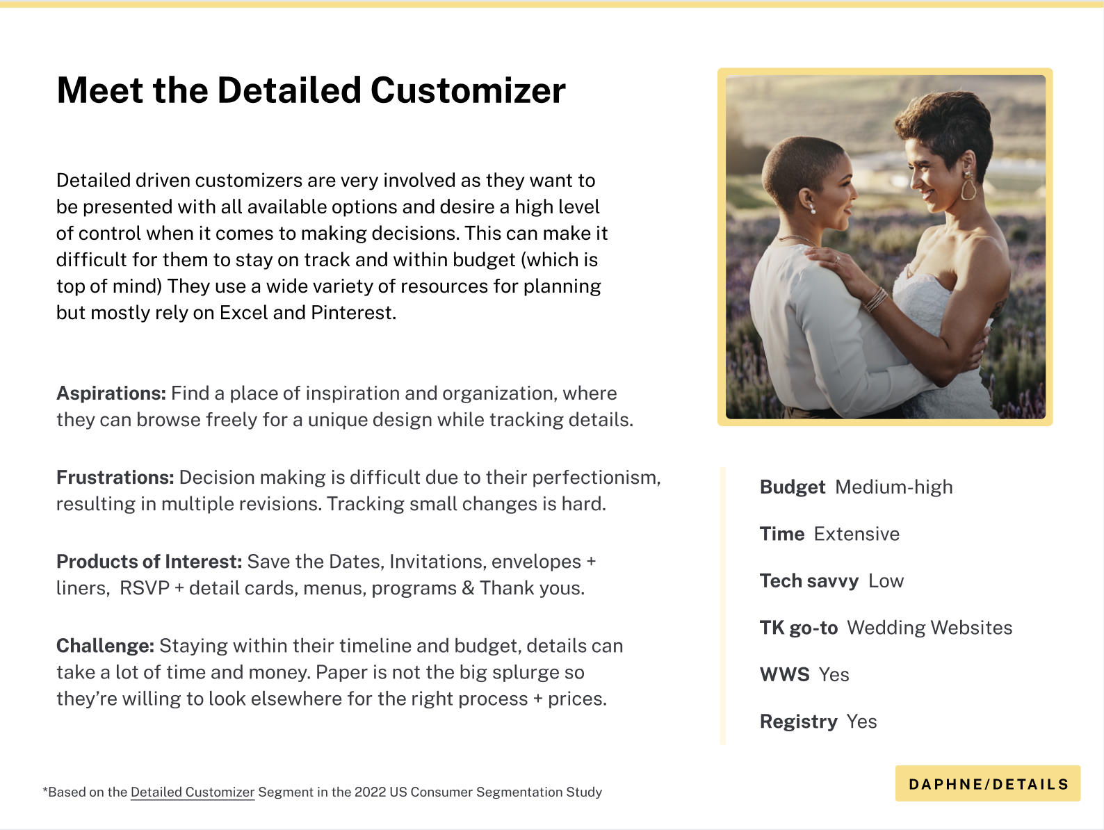 To align our product roadmap with high-value user segments, I developed three primary personas centered on the Invitations and Wedding Website verticals. By synthesizing quantitative marketing data with qualitative insights from direct user interviews, I mapped the distinct motivations and pain points of our audience. These archetypes serve as a strategic bridge, balancing the lived experience of our current users with the long-term growth objectives of the business to ensure our feature prioritizations drive both empathy and conversion.