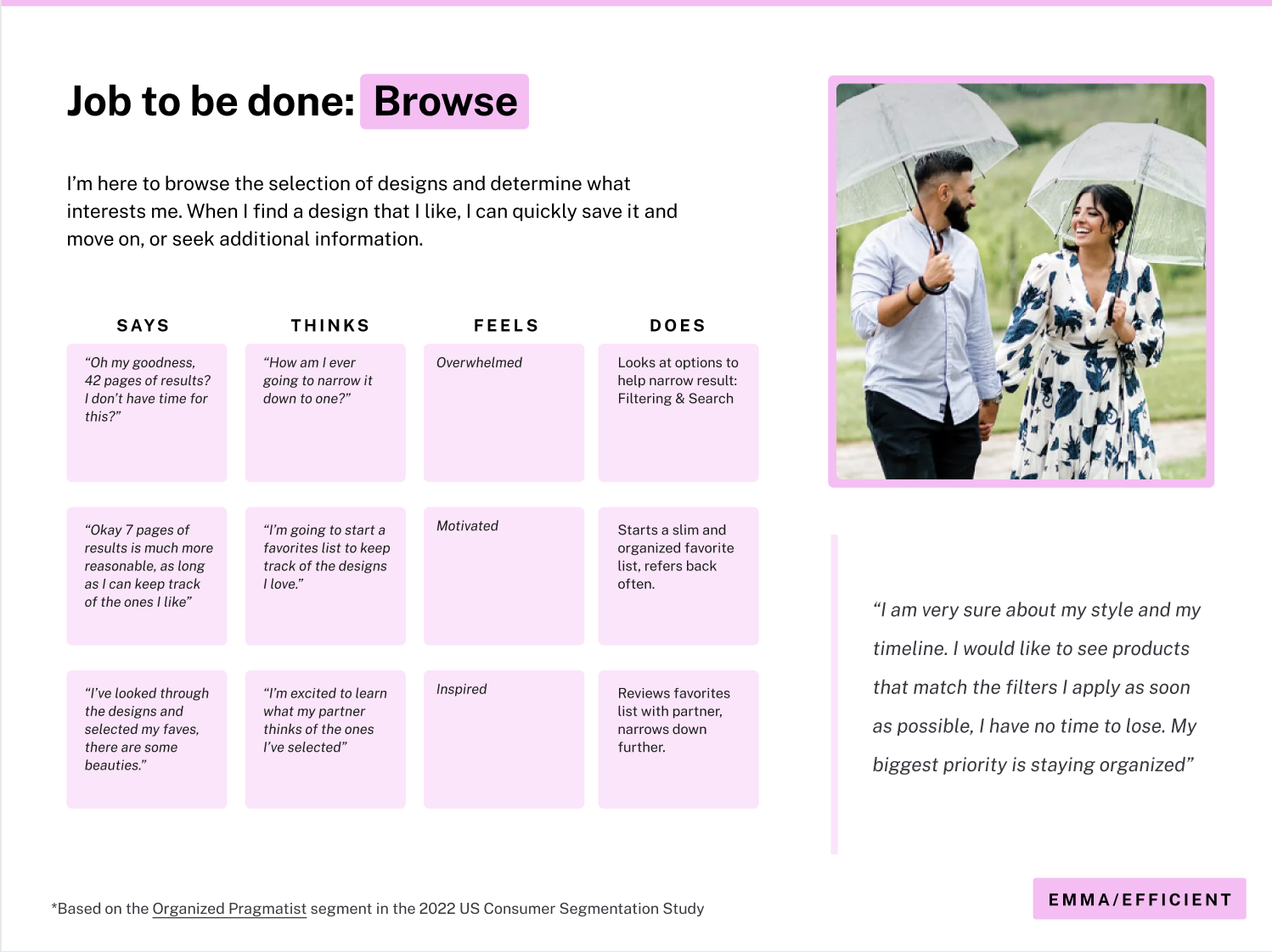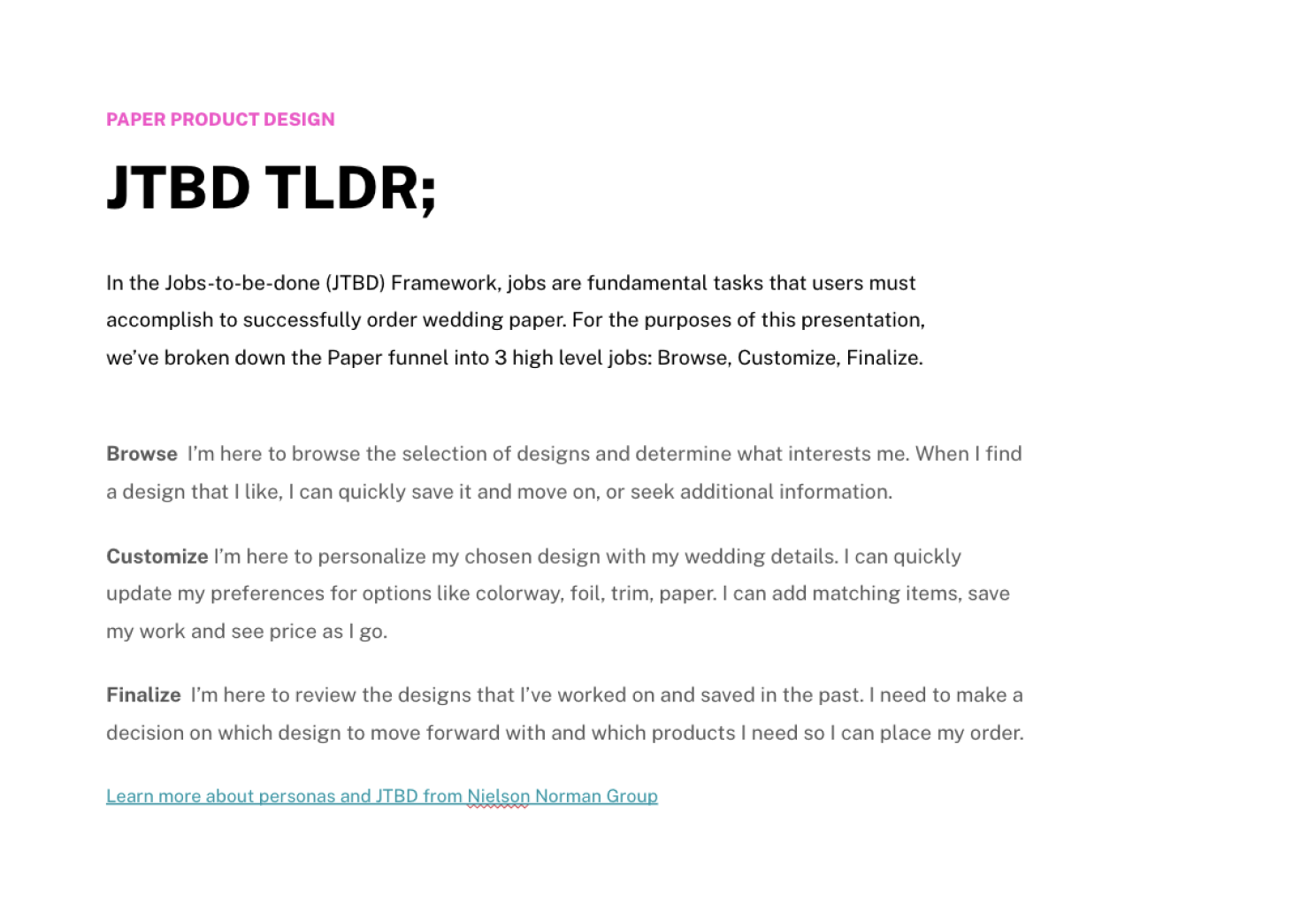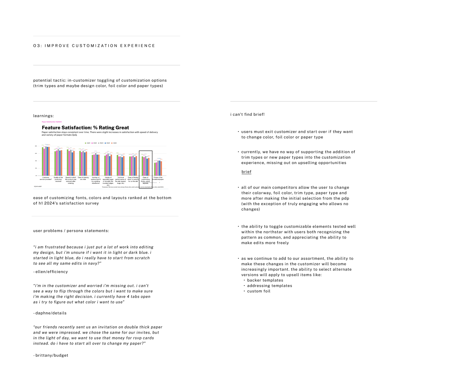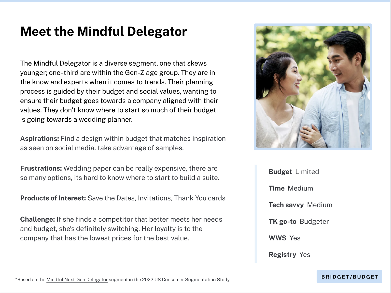 To align our product roadmap with high-value user segments, I developed three primary personas centered on the Invitations and Wedding Website verticals. By synthesizing quantitative marketing data with qualitative insights from direct user interviews, I mapped the distinct motivations and pain points of our audience. These archetypes serve as a strategic bridge, balancing the lived experience of our current users with the long-term growth objectives of the business to ensure our feature prioritizations drive both empathy and conversion.
